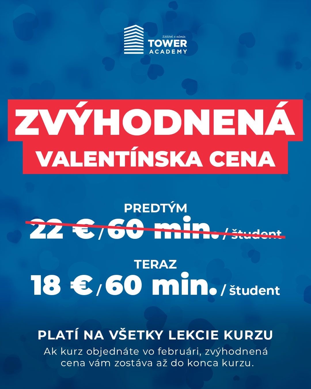 Ak si kurz objednáte vo februári, získate valentínsku cenu 18 € / 60 minút / študent (namiesto pôvodných 22 €) — a táto cena vám zostáva počas celého trvania kurzu, aj keď bude pokračovať v marci, júni alebo neskôr.
